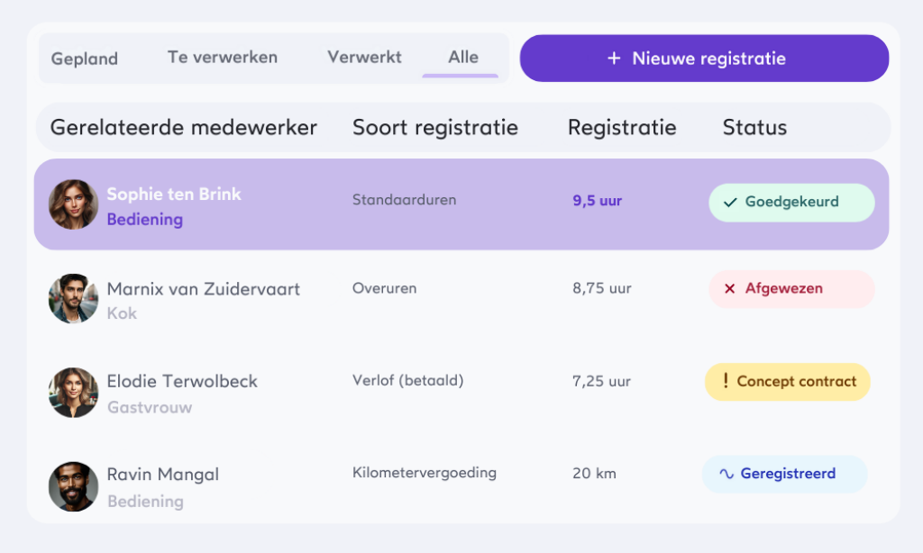 Contracten, uren, verlof en uitbetalingen van je medewerkers online in één overzicht.
