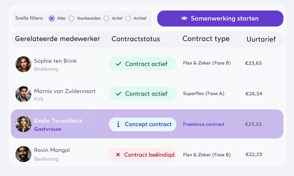 Werk met zzp'ers en beheer al je opdrachten in één overzicht: contracten, uren, facturen en betalingen. En betaal zelf alles in één keer.